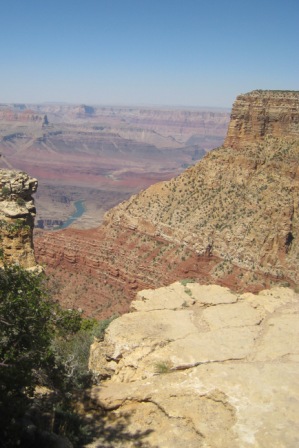 We drove our rental car for about an hour from Williams to the Grand Canyon. The road was straight and the countryside was arid. The trees increased in size as we approached the Grand Canyon but we couldn't see it until we were in the parking lot. The Canyon is so vast (roughly ten miles across and hundreds of miles long) that pictures don't do it justice.